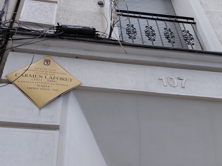 Con el silencio de “La niña tímida en el recreo” (pág. 34), y mi nuevo libro recién firmado, volví a perderme por esas calles cuadriculadas de Madrid donde nunca logro orientarme. No obstante, mi despiste fue dichoso, porque el azar me puso ante la casa donde Carmen Laforet escribió su novela Nada, situada en la calle General Pardiñas, 107.
