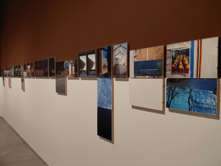 Además del trabajo pictórico, la muestra ofrece una serie de fotografías que permiten asomarse a un álbum de fotos casi privado, presentado como un collage y cierto aire de proyecto en curso. Ante la mezcla de instantáneas, reconecté con el placer de la creación y el juego que me permití con mi primera cámara digital. Captar el hallazgo del instante, la sorpresa de la calle y de la vida en paisajes y ventanas, texturas y sombras, contenedores y luces. Es decir, la fotografía que ya no requiere del viaje o el acontecimiento sino inspirada por lo cotidiano, que sale al paso y es bello sin serlo.