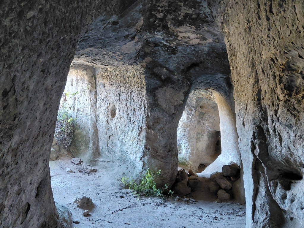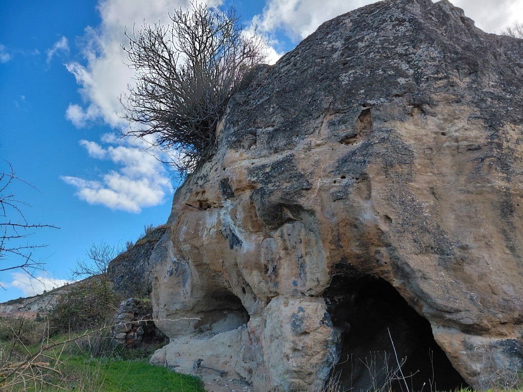Al día siguiente, guiados por la información de la web Lugares con Historia, nos propusimos visitar la Cueva de los Moros, situada en la carretera de Pastrana a Valdeconcha. Aprisco para ganado, santuario rupestre o lugar eremítico, se dice que San Juan de la Cruz pasó tiempo en ella. A falta de señal alguna, pasamos de largo, llegamos a Valdeconcha y dimos la vuelta, gracias a las indicaciones de un vecino, tan extrañado por el nombre como por nuestro interés. El hallazgo mereció la pena porque el inquietante lugar ofrece una serie de galerías donde resuena nuestra memoria como especie, y las huellas del fuego conviven con petroglifos y feos grafitis recientes. Refugio entre la piedra y la vegetación exterior, lugar de oración y descanso, oscuridad que se abre a la luz de un cielo que marca las horas. Inevitable preguntarse si no está indicado para evitar actos vandálicos o por pura desidia en la divulgación del patrimonio cultural. Personalmente, me temo que es lo segundo dado que, a pesar de las fechas de Semana Santa, algunos de los principales monumentos de la zona permanecían con su horario habitual: Recópolis, el Monasterio de Monsalud y el Convento del Carmen de Pastrana, cerrados de lunes a miércoles.