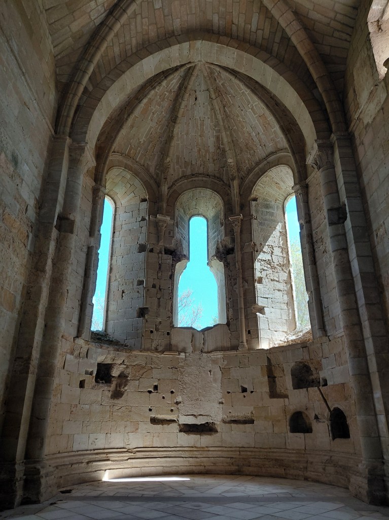 La última parada de nuestro viaje fue el Monasterio de Monsalud que disfrutamos escudriñando cada rincón, en pleno proceso de consolidación y restauración, gracias a las explicaciones entusiastas de su guía. El claustro, la antigua portería, el refectorio, la sacristía, la iglesia, la sala capitular… desfilaron ante nuestros ojos. Aunque algunos de esos espacios careciesen de cubierta y no quedasen imágenes religiosas, la imaginación y la memoria de otros monasterios suplía ese vacío que, sin embargo, emanaba una belleza serena que solo la piedra desnuda puede expresar y el enclave natural enfatizaba.