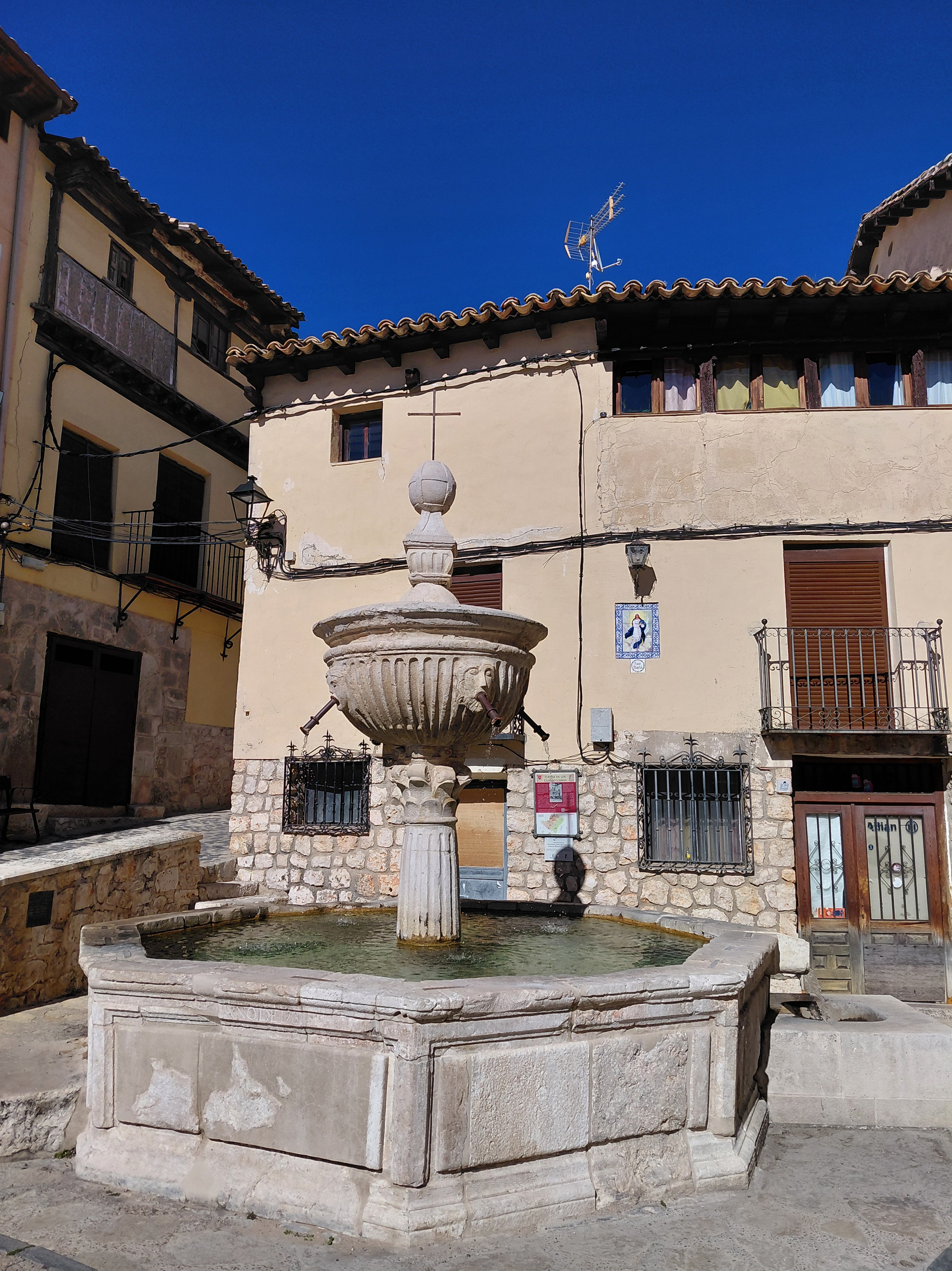 La oficina de turismo está ofreciendo una vista y se encuentra cerrada, así pues… callejeamos guiados por el instinto a lo largo de una serie de puntos de referencia (Ayuntamiento, Colegiata y oficina de Correos), y paneles que convierten Pastrana en un lugar familiar, un trazado urbano sin pérdida posible. Las calles y plazas lucen limpias y el agua aviva las fuentes que marcaron la historia pequeña de la ciudad (lavaderos y agua potable); la primavera asoma en los árboles florecidos que superan las tapias de algunos patios; los gatos toman el sol y vigilan nuestros pasos mientras el trino de los pájaros llena todo el silencio. El recorrido también muestra fincas en estado de ruina, solares y casas a la venta desde hace tanto que el número de teléfono ha desaparecido, devorado por el sol y el abandono.